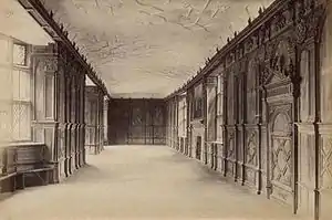 According to legend (none of which can be verified), Sir George disapproved of the union, possibly because the Manners were Protestants, and the Vernons were Catholics, or possibly because the second son of an earl had uncertain financial prospects.[6][7] According to the legend, Sir George forbade Manners from courting the famously beautiful and amiable Dorothy and forbade his daughter from seeing Manners.[5] Torn by her love for her father and her love for John Manners, Dorothy fled Haddon Hall to elope with Manners. Shielded by the crowd during a ball given by Sir George, Dorothy slipped away and fled through the gardens, down stone steps and over a footbridge where Manners was waiting for her, and they rode away to be married.[8] The supposed elopement became the subject of several novels and other works of fiction and drama.[9] The marriage could have been held at Sir George's manor at Aylestone, Leicestershire, the Bakewell church or the chapel in Haddon Hall, although no written record survives.[3][8] If indeed the elopement happened, the couple were soon reconciled with Sir George, as they inherited the estate on his death two years later.[8][10] The couple had at least two children, George and Roger.[11]