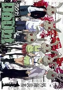 The cover of the first Japanese manga volume release, featuring the cast wearing the rabbit masks