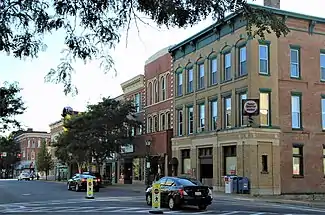 The district contains 78 contributing buildings centered on the city's "four corners" formed at the intersection of Main and Fulton Streets, but also included properties on Church, Fremont, Spring and Prospect Streets. It encompasses the historic commercial district. Within the district boundaries, 79 percent of the buildings are commercial, eight percent religious, five percent residential, and the remaining service and educational. They range in age from pre-1850 to 1977, and are architecturally significant from pre-1850 to 1931. The majority were built 1870 to 1900, and include a variety of popular architectural styles, including Neoclassical, Renaissance Revival, Romanesque Revival, Second Empire, and Art Deco. The predominant commercial building style is Italianate and is a three-story brick structure with projecting, bracketed cornices and details.[3][2]