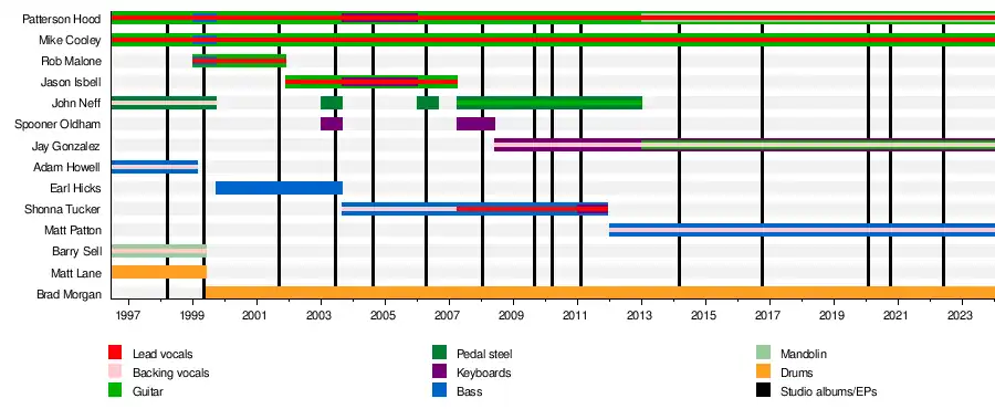 The band currently consists of Mike Cooley (lead vocals, guitar, banjo), Patterson Hood (lead vocals, guitar), Brad Morgan (drums), Jay Gonzalez (keys, guitar, accordion, backing vocals), and Matt Patton (bass guitar, backing vocals). The line-up has undergone multiple changes since the band's formation, with Cooley and Hood serving as the sole constants throughout.[3] The band's constant touring has developed a dedicated following.[4]