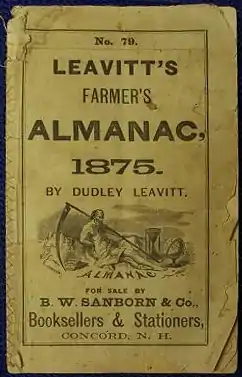 Dudley Leavitt (1772 – September 20, 1851) was an American publisher. He was an early graduate of Phillips Exeter Academy[1] in his native town of Exeter, New Hampshire, and later moved to Gilmanton where he first edited a newspaper and taught school. Within a few years, Leavitt relocated to Meredith, where in addition to teaching school and farming, he began publishing in 1797 Leavitt's Farmers Almanack, one of the nation's earliest farmers' almanacs.[2] A polymath, Leavitt poured his knowledge of disparate fields including mathematics, language and astronomy into the wildly popular almanacs, which outlived their creator, being published until 1896. The inaugural issue of 1797 carried the title of The New England Calendar: Or, Almanack for the Year of Our Lord 1797. On the cover was the disclaimer that the new publication was "Calculated for the Meridian of Concord, Latitude 43° 14' N. Longitude 72° 45' W.: And with But Little Variation Will Answer for Any of the New England States."[3]