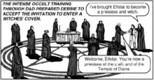 The concept of Dungeons & Dragons as Satanic was linked to Satanic ritual abuse, in that both presumed the existence of large, organized Satanic cults and societies.[4] Sources such as the Dark Dungeons tract from Chick Publications portray D&D as a recruitment tool for these organizations.[7][8][9][10][11]