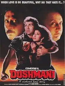 Dushmani (lit. 'Enmity') is a 1995 Indian Hindi-language romantic action film directed by Bunty Soorma. It stars Sunny Deol, Jackie Shroff, Manisha Koirala, Deepti Naval, Anupam Kher in pivotal roles.[2][3] The rights of this film are now owned by Shah Rukh Khan's Red Chillies Entertainment.[4] Acclaimed director Shekhar Kapur directed major portions of the film.[5]