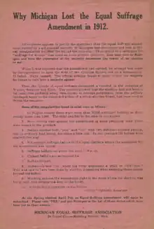 In addition to supporting non-violent dispute resolution, Warriner also supported the enfranchisement of women prior to the enactment of the 19th Amendment.[15] He was a member of the Michigan Equal Suffrage Association and a President of its local chapter. Women's suffrage appeared as a Michigan referendum in 1912. It failed, and in 1913 the Michigan Equal Suffrage Association claimed that the failure was due to election fraud. In a speech delivered in 1914, Warriner stated "I am fully persuaded in my own mind of the justice of the demand of the women for a right to vote."