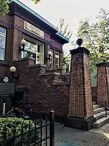 Live Oak Public Library System celebrating centennial anniversary documents describe the building's the Prairie architecture influences noting: "The monumental staircase leading to the main entrance on the second floor is framed by two enormous piers with sandstone orbs on small pedestals. Additionally there are four tiered brick walls with sandstone coping which flank the staircase. The corners of the piers are delineated by dark glazed bricks, a motif repeated in a horizontal band over the second floor windows and projecting brick cornice that visually divides the first and second stories. This emphasis on horizontality achieved through the coping and polychromed brickwork is a key element of the architecture of the Prairie School, pioneered by Frank Lloyd Wright and his contemporaries. The interior continues to show the influence of Wright in the geometric and floral motifs incorporated on columns and pilasters." The flat roof and second-floor staircase, as well as the ornaments on the outside and the inside lend themselves to the Prairie School. And on the whole, the entire building, inside and out reflects a coordinated geometrical approach to architecture that is unlike any other in the city.