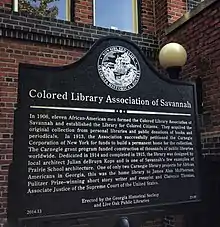 - The Georgia Historical Society. (2014, December 9). Colored Library Association of Savannah. Retrieved March 1, 2018, from Georgia Historical Society -Georgia History: http://georgiahistory.com/ghmi_marker_updated/colored-library-association-of-savannah/