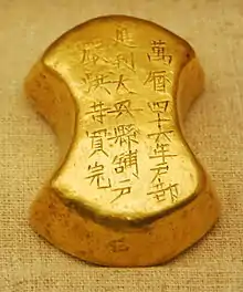 The early Ming dynasty attempted to use paper currency, with outflows of bullion limited by its ban on private foreign commerce.[1] Like its forebears, the currency experienced massive counterfeiting and hyperinflation. (In 1425, Ming notes were trading at about 0.014% of its original value under the Hongwu Emperor.)[2] The notes remained in circulation as late as 1573 but their printing was ended in 1450. Minor coins were minted in base metals, but trade mostly occurred using silver ingots. As their purity and exact weight varied, they were treated as bullion and measured in tael. These privately made "sycee" first came into use in Guangdong, spreading to the lower Yangtze sometime before 1423, the year it became acceptable for payment of tax obligations. In the mid-15th century, the paucity of circulating silver caused a monetary contraction and extensive reversion to barter.[3] The problem was met through smuggled, then legal, importation of Japanese silver (mostly through the Portuguese and Dutch) and Spanish silver from Potosí carried on the Manila galleons. Provincial taxes were required to be paid in silver in 1465; the salt tax, in 1475; and corvée exemptions, in 1485. By the late Ming, the amount of silver being used was extraordinary: at a time when English traders considered tens of thousands of pounds an exceptional fortune, the Zheng clan of merchants regularly engaged in transactions valued at millions of taels. However, a second silver contraction occurred in the mid-17th century when King Philip IV began enforcing laws limiting direct trade between Spanish South America and China at about the same time the new Tokugawa shogunate in Japan restricted most of its foreign exports, cutting off Dutch and Portuguese access to its silver. The dramatic spike in silver's value in China made payment of taxes nearly impossible for most provinces.[4] In extremis, the government even resumed use of paper currency amid Li Zicheng's rebellion.