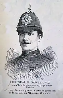 On 28 March 1879 at the Battle of Hlobane, South Africa, Private Fowler, with a captain and a lieutenant (Henry Lysons) dashed forward in advance of the party which had been ordered to dislodge the enemy from a commanding position in natural caves up the mountain. The path was so narrow that they had to advance in single file and the captain who arrived first at the mouth of the cave was instantly killed. The lieutenant and Private Fowler undismayed by the death of their leader, immediately sprang forward and cleared the enemy out of their stronghold.[1]