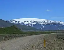 Eiríksjökull (Icelandic for "Eirík's glacier", Icelandic pronunciation: [ˈeiːriksˌjœːkʏtl̥] ⓘ) is a glacier north-west of Langjökull in Iceland, with an area of 22 km2 (8.5 sq mi) reaching a height of 1,675 m (5,495 ft),[1] making it the largest table mountain in Iceland.[2] Rising over 1,000 m (3,300 ft) above its surrounding, the lowest 350 m (1,150 ft) of a hyaloclastite (móberg) tuya formed presumably by a single subglacial volcanic activity is capped by a 750 m (2,460 ft) thick lava shield.[2][3] It is currently dormant or extinct in terms of volcanic activity.[4]