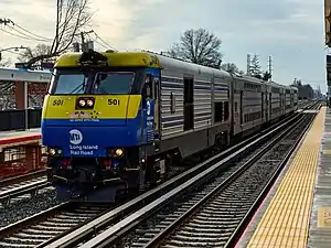 DM30AC 501 primarily diesel locomotive operating in electric locomotive mode from a third rail at New Hyde Park, USA