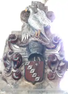 Heraldic achievement of Elize Hele, top of monument in Bovey Tracey Church. Crest: On a chapeau gules turned up ermine, an eagle close argent.[2] Use of a cap of maintenance in a crest in place of the usual torse on top of the helm, denotes a special privilege[3]