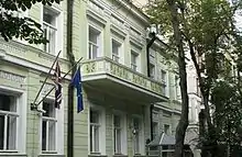 The British Embassy Kyiv (Ukrainian: Посольство Великої Британії в Києві) is the British sovereign's diplomatic mission to Ukraine, representing the United Kingdom and the United Kingdom's interests. The embassy is located on Desyatynna street in the Pecherskyi District of the city, right opposite to the building of the Ministry of Foreign Affairs of Ukraine. The British Ambassador to Ukraine is Martin Harris who was appointed in 2023.[1]