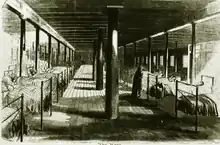 Before the American Civil War, military nursing in the United States was dominated by men and was not viewed as a good career for women. However, the massive amount of illness and number of casualties on both sides of the war brought women of all ages and economic classes to the sometimes makeshift hospitals that were set up during the war.[1] When the Civil War broke out in 1861, Parsons, at the age of 37, expressed a desire to assist the Union army by working as a nurse. Her father tried to dissuade her, since he felt with all of her disabilities, she would not be very useful as a nurse and might put her own health in danger. Nonetheless, she began training as a volunteer at the Massachusetts General Hospital. After eighteen months, she was put in charge of a ward of fifty wounded Union soldiers at Fort Schuyler Military Hospital on Long Island in October 1862.