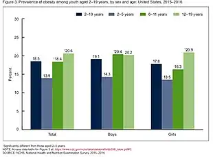 According to the CDC, For the 2015–2016 year, the CDC found that the prevalence of obesity for children aged 2–19 years old, in the U.S., was 18.5%.[7] The current trends show that children aged 12–19 years old, have obesity levels 2.2% higher than children 6–11 years old (20.6% vs. 18.4%), and children 6–11 years old have obesity levels 4.5% higher than children aged 2–5 years old (18.4% vs. 13.9%). Boys, 6–19 years old, have a 6.1% higher prevalence of obesity, than boys aged 2–5 years old (20.4% vs. 14.3%). While girls aged 12–19 years old, have a 7.4% greater prevalence of obesity, than girls aged 2–5 years old (20.9% vs. 13.5%).[7]