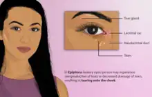 Epiphora is an overflow of tears onto the face, other than caused by normal crying. It is a clinical sign or condition that constitutes insufficient tear film drainage from the eyes, in that tears will drain down the face rather than through the nasolacrimal system.[1]