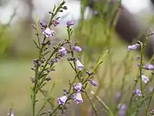 Eremophila dichroantha, also known as bale-hook eremophila, is a flowering plant in the figwort family, Scrophulariaceae and is endemic to the south-west of Western Australia. It is a shrub with many ascending branches making the plant appear broom-like. It has small, hooked leaves and small, though abundant, violet to lilac-coloured flowers.
