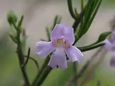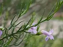 The flowers are borne singly or in groups of up to 3, in leaf axils on a smooth, shiny stalk 6–30 mm (0.2–1 in) long. There are 5 overlapping, egg-shaped to lance-shaped, shiny green sepals which are 3.5–6 mm (0.1–0.2 in) long. The petals are 12–25 mm (0.5–1 in) long and joined at their lower end to form a tube. The petals are a blue, mauve or purple on the outside and white inside the tube. The petal tube and the lobes are shiny and glabrous but the inside of the tube is filled with long, soft hairs. The 4 stamens are fully enclosed in the petal tube. Flowering occurs in many months of the year but mostly in August and September. The fruits which follow are oval to oblong in shape, glabrous, shiny and sticky and 4.5–7.5 mm (0.2–0.3 in) long.[2][3]