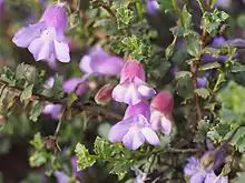 The flowers are borne singly or in pairs in leaf axils on a sticky stalk, usually 9–18 mm (0.4–0.7 in) long. There are 5 green to purplish-brown, lance-shaped to egg-shaped overlapping sepals which are very hairy on their inner surface. The petals are 16–23 mm (0.6–0.9 in) long and are joined at their lower end to form a tube. The petal tube is deep purple to mauve on the outside and white with yellow-brown spots inside. The outside of the tube and petal lobes are densely hairy but the inside of the lobes is glabrous and the inside of the tube is woolly. The 4 stamens are fully enclosed in the petal tube. Flowering occurs from March to October and is followed by woody, almost spherical fruits which have a hairy, papery covering and are 5.5–8.5 mm (0.2–0.3 in) in diameter.[2][3]