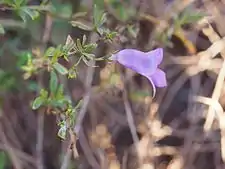 The flowers are usually borne singly in leaf axils on an S-shaped stalk, usually 10–20 mm (0.4–0.8 in) long. There are 5 overlapping, green, lance-shaped, sepals which are mostly 2.5–6.5 mm (0.1–0.3 in) long. The petals are 11–24 mm (0.4–0.9 in) long and are joined at their lower end to form a tube. The petal tube is deep lilac to purple on the outside and white with dark purple spots on the inside. The outside of the petal tube is hairy, but the inside surface of the lobes is glabrous while the inside of the tube is filled with woolly hairs. The 4 stamens are fully enclosed in the petal tube. Flowering occurs from March to October and the fruits which follow are oval to almost spherical, dry with a hairy, papery covering and are about 5–7 mm (0.2–0.3 in) long.[2][3]