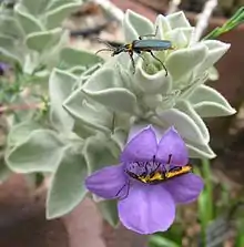 The flowers are borne singly in leaf axils and lack a stalk. There are 5 linear sepals which are 10–15 mm (0.4–0.6 in) long, almost claw-like at the tip and covered with a thick layer of hairs similar to those on the leaves. The petals are 25–35 mm (0.98–1.4 in) long and are joined at their lower end to form a tube. The petal tube and its lobes are lilac-coloured to light purple or blue-mauve, with pale purple spots inside the tube. The outside of the tube and lobes is densely covered with branched hairs, the inside surface of the lobes is glabrous and the inside of the tube is densely woolly. The 4 stamens are fully enclosed in the petal tube. Flowering occurs between June and October and is followed by fruit which are cone-shaped to flask-shaped, 6–7 mm (0.2–0.3 in) long with a hairy covering.[2][3]