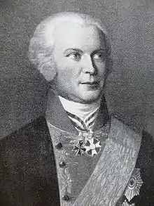 With the rank of Oberst (colonel), Rüchel fought against the First French Republic during the War of the First Coalition. During the Siege of Mainz from 10 April to 23 July 1793, he commanded a brigade consisting of the Thadden and Legat Fusilier Battalions and the Wolframsdorf Grenadier Battalion.[1] After promotion to General-major, he led the Prussian contingent during the Second Battle of Wissembourg in December 1793. The units coming under his orders were eight battalions in the Infantry Regiments Kleist Nr. 12, Wolframsdorf Nr. 37, and Hertzberg Nr. 47, two foot jäger companies, three squadrons of the Wolfradt Hussar Regiment Nr. 6, one and one-half horse artillery batteries, and a half 6-pound foot battery.[2]