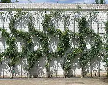 Espalier (/ɪˈspælɪər/ or /ɪˈspæli./) is the horticultural and ancient agricultural practice of controlling woody plant growth for the production of fruit, by pruning and tying branches to a frame. Plants are frequently shaped in formal patterns, flat against a structure such as a wall, fence, or trellis, and also plants which have been shaped in this way.[1]