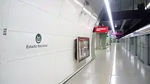 Estadio Nacional is an underground metro station on the Line 6 of the Santiago Metro, in Santiago, Chile. This station is so named due to being in the northeastern corner of the Estadio Nacional Julio Martínez Prádanos, main sports center of the country. The station has a special design, different from the rest of the stations, because its large dimensions allow managing large flows of people during sporting or recreational events in the stadium. The station was opened on 2 November 2017 as part of the inaugural section of the line, between Cerrillos and Los Leones.[1]