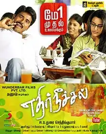 Ethir Neechal (transl.Swimming against the tide) is a 2013 Indian Tamil-language sports comedy drama film written and directed by R. S. Durai Senthilkumar in his directorial debut. The film stars Sivakarthikeyan, Priya Anand and Nandita Swetha. Produced by Dhanush under his studio Wunderbar Films, it was distributed by S. Madhan under the banner Vendhar Movies.[2] Principal photography commenced on 23 July 2012, and was ended on 22 February 2013. The music for the film is composed by Anirudh Ravichander, with cinematography performed by Velraj and editing by Kishore Te. The film was released on 1 May 2013 to generally positive reviews and became a blockbuster.