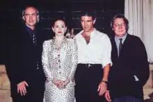 From left to right: Jonathan Pryce, Madonna, Antonio Banderas and Alan Parker during a press conference in Buenos Aires on February 6, 1996.