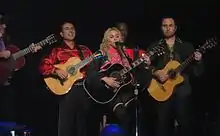 According to the film's music producer Nigel Wright, the lead actors would first sing the numbers backed by a band and orchestra before working with Parker and music supervisor David Caddick "in a more intimate recording environment [to] perfect their vocals".[46] More trouble arose as Madonna was not completely comfortable with "laying down a guide vocal simultaneously with an 84-piece orchestra" in the studio. She was used to singing over a pre-recorded track and not having musicians listen to her. Also, unlike her previous soundtrack releases, she had little to no creative control. "I'm used to writing my own songs and I go into a studio, choose the musicians and say what sounds good or doesn't ... To work on 46 songs with everyone involved and not have a big say was a big adjustment," she recalled.[47] An emergency meeting was held between Parker, Lloyd Webber and Madonna, where it was decided that the singer would record her part at Whitfield Street Studios, a contemporary studio, while the orchestration would take place elsewhere. She also had alternate days off from the recording to preserve and strengthen her voice.[5][48]