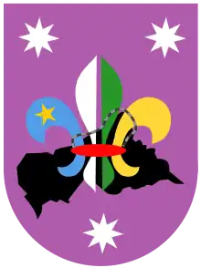 The Scout emblem incorporates the color scheme of the flag of the Central African Republic, superimposed on a map of the country.