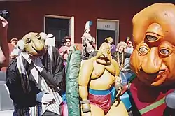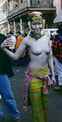 The Faubourg Marigny neighborhood of New Orleans, Louisiana is one of the most active on Mardi Gras Day, with many elaborate costumers strolling the streets. This part of town is relatively little visited by tourists compared to other areas with active celebrations.