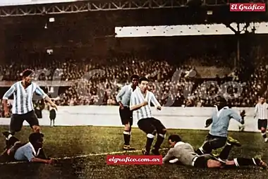 - 2010: Football historian Didier Rey, writing for the French newspaper Libéracion on July 6, 2010, wrote: "When in 1930, two years after the victory in Amsterdam, La Celeste imposed its law on Argentina again in the final of the first edition of the 1930 World Cup organized by FIFA, becoming the first triple world champion in the history of football, which was consecrated in a span of just six years."[40] Rey further added: "This required a tacit agreement between FIFA and the IOC, which stated that a victory at the Olympic games effectively designated the world champion."[41]