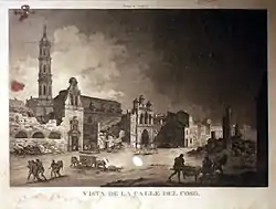 The War of the Napoleonic French invasion of 1808 leaves very much ravaged the convent building; still persists the slender Mudéjar tower of the church, of three bodies, where can be seen the central nave of the church and its two lateral bodies for the chapels that are among the sections that form the buttresses, and the gateway to the convent, crowned with three Mudéjar turrets, as make evident an engraving of the time, which still it see remains of the Cross of the Coso in front of the facade of the convent are appreciated. In the next onslaught of the invading troops, the devastating work of the French mines to break the siege was very much worse the damage.