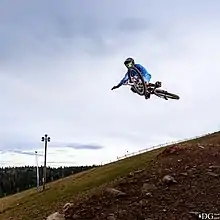 A slopestyle competitor performing a trick during the Freeride Mountain Bike World Tour, hosted at the Natural Games in Millau, France.