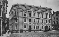 The design of the building was created in 1875 to order of Friedrich Emil Pitzschky, the owner of an insurance company. The building permit was granted in June 1875 and the construction work was carried out between 1876 and 1877.[1] The tenement housed the offices of insurance and shipping companies, including the management of Pitzschky's company. On 14 June 1910 the building was sold for 192,500 marks to the society "Volkshaus".[1] In 1939 the building became the property of the representation of workers and employers of the Deutsche Arbeitsfronts Gau Pommern.[1] In 1944 the building was damaged in a bombardment and was never rebuilt. In the 1990s, as part of the revitalisation of Podzamcze (lower Old Town below the Ducal Castle), a post-modern building was erected on original foundation.[2] Formally it is one building,[3] but its façade consists of three different segments, imitating separate houses.[4][5]