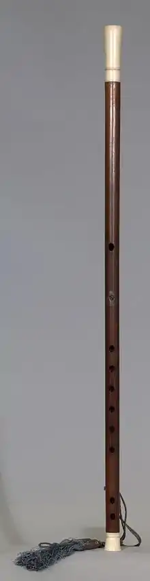 The earliest fue may have developed from pitch pipes known as paixiao in Chinese.[4] The gabachi instrument eventually made its way over to Japan from China in the 5th century,[5] becoming prevalent during the Nara Period.