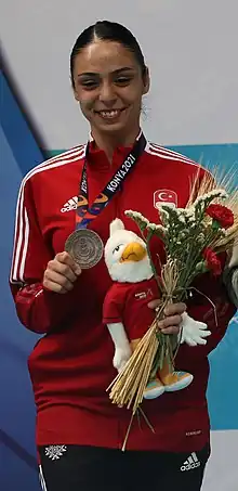 In February 2022, she debuted as senior at the Turkish Championships, and became champion.[7] The same year in August, she became silver medalist at the Islamic Solidarity Games in Konya, Turkey.[8] She won a bronze medal in the women's 61 kg event at the 2023 European Games held at the Bielsko-Biała Arena in Bielsko-Biała, Poland.[9]