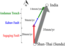 This figure shows the India plate motion with reference to the Shan Thai (Sunda) plate. The N10°E 35 mm/yr convergence is accommodated by the 20 mm/yr right lateral Sagaing strike slip fault, the 9 mm/yr convergent Kabaw thrust fault and 14 mm/yr subduction the Andaman Trench. Modified from Socquet et al. 2006.[20]