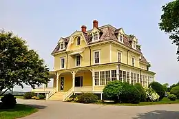 In 1867, Mason's son began working with him, and in 1871, he brought his son into partnership and renamed his firm George C. Mason & Son. In 1873, the firm designed the commanding officer's quarters (today known as the "Eisenhower House") at Fort Adams in Newport, which President Dwight D. Eisenhower used as his summer residence during his administration.[5][6] "Woodbine Cottage," which Mason built for himself in 1873 in collaboration with his son, was a 23-room mansion in an ornate Swiss chalet style. Like the slightly earlier "Edgewater" (1869–70), it features the elaborate kinds of wooden trim that increasingly crept into Mason's later work. It has since been turned into a hotel, the Architect's Inn.[7] Possibly the most stylistically adventurous of Mason's mature work is the "Loring Andrews House", which expresses the Modern Gothic style through facades that are almost completely covered in stick work.[2]