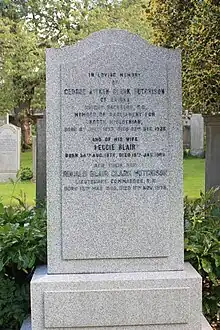 He died on 22 December 1928 in Edinburgh, aged 55.[3] He is buried in the northern (independent) extension to Dean Cemetery on Queensferry Road. The grave lies on one of the central east–west paths, towards the eastern side.
