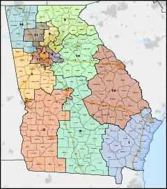 List of members of the United States House delegation from Georgia, their time in office, district maps, and the district political ratings according to the CPVI. The delegation has a total of 14 members, with nine Republicans and five Democrats as of 2023.