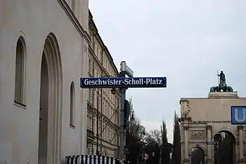 48°09′02.68″N 11°34′50.25″E / 48.1507444°N 11.5806250°E / 48.1507444; 11.5806250 Geschwister-Scholl-Platz (Scholl Siblings Plaza) is a short semi-circular plaza located in front of the main building of the Ludwig Maximilian University of Munich (Ludwig-Maximilians-Universität München), located on the Ludwigstraße in Munich, Germany.[1] The plaza is named in memory of Sophie Scholl and her brother, Hans Scholl, students at Ludwig Maximilian University of Munich during World War II who were among the founding members of the White Rose (Weiße Rose) resistance movement. They were the Geschwister Scholl (Scholl Siblings).[2]