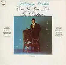 Give Me Your Love for Christmas is the third Christmas album by American pop singer Johnny Mathis and was released by Columbia Records on October 13, 1969.[1] The oldest song selected for this project was the 1934 classic "Santa Claus Is Coming to Town", which meant there were not the traditional hymns that could be found on his previous Christmas outings. He did, however, cover several other contemporary Christmas favorites along with a few new and lesser-known songs, such as the title track, which was a reworking of an unreleased recording of his from 1961,[2] and "Christmas Day", which came from the then-current Broadway musical Promises, Promises. New versions of "Have Yourself a Merry Little Christmas" and "The Little Drummer Boy", which he also recorded in 1963 for his previous Christmas LP, Sounds of Christmas, made the final track list here as well.
