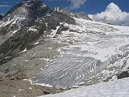Due to its location near the highway and railway, the Illecillewaet Glacier is the most visited and photographed. Formerly known as the Great Glacier, it was a major tourist attraction during the Glacier House period from 1886 to 1925. The glacier's terminus, formerly a short walk from the Glacier House site, has retreated far up the mountainside. The névé of the glacier spreads far to the south, also spawning the Geikie Glacier. Most of the large glacial features are south of the Trans-Canada corridor. Other large features include the Deville, Dawson, Asulkan, Bishops, Black, Duncan, Grand, and Avalanche. The park's glaciers have a variety of appearances, with high altitude features smooth and uniform, cracked and riddled with crevasses on the slopes, and black with debris on the valley bottoms. In summer, many of the glaciers take on a red tint; this is the result of a variety of snow algae known as watermelon snow. [25]