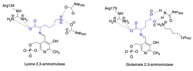 By comparing the amino acid sequences of a closely related enzyme to glutamate 2,3-aminomutase, lysine 2,3-aminomutase, researchers were able to identify key catalytic residues in glutamate 2,3-aminomutase that are distinguishing from similar aminomutases. In the case of lysine 2,3-aminomutase, lysine is bound to the enzyme in the active state, whereas glutamate 2,3-aminomutase has glutamate bound in the active state. Both enzymes appear to bind α-carboxylate groups on their respective amino acid substrates in a similar manner using arginine residues at positions 134 (lysine 2,3 aminomutase) and 173 (glutamate 2,3-aminomutase). However, the binding of the amino acid side chains differs because lysine confers basic properties where as glutamate confers acidic properties. The proposed identifying residues of a glutamate 2,3-aminomutase are Lys332 and Asn369 which likely bind the γ–carboxylate group of glutamate. This is the key difference from lysine 2,3-aminomutase because that enzyme uses Asp293 and Asp330 to bind the ε–aminium group of lysine. The proposed differences lead to a unique hydrogen bonding pattern to further distinguish glutamate 2,3-aminomutases from lysine 2,3-aminomutases which is shown here:[2]