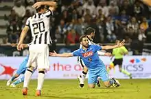 On 26 October 2014, Higuaín scored his first three league goals of the season in a 6–2 home win over Hellas Verona.[60] In the 2014 Supercoppa Italiana against Juventus in Doha, Qatar, on 22 December, Higuaín equalised twice, forcing extra time and then a penalty shootout, in which he was one of the scorers in a Napoli victory.[61]