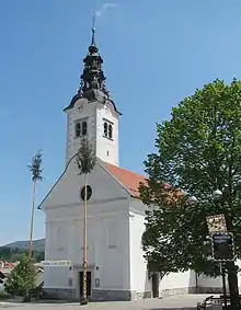 The parish church is dedicated to the martyrdom of Saint John the Baptist. It dates to the second half of the 17th century and was built on the site of a smaller chapel. It was remodeled in the 18th century, when the nave was extended, the side chapels were walled in, and the current belfry and main facade were created. Paintings dating to circa 1700 decorate the nave and presbytery. The main altar is late Baroque; it has been reworked several times and has paintings by Janez Wolf (1825–1884) and Matija Bradaška (1852–1915).[5][6]