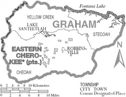 Portions of the Qualla Boundary are located in Graham County. These sections of the Qualla Boundary are non-contiguous from the primary part of the Qualla Boundary located in Swain, Jackson, Cherokee and Haywood counties. The Eastern Band of Cherokee Indians who live in Graham County form the Snowbird Cherokee community.