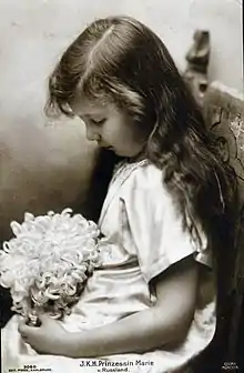 Maria was raised in Coburg and in Saint-Briac, France. She was born Princess Maria Kirillovna of Russia, but her father granted her the title Grand Duchess of Russia with the style Imperial Highness when he declared himself Guardian of the Throne in 1921. As a child, the dark-haired, dark-eyed Maria[1] took after her maternal grandmother, Grand Duchess Maria Alexandrovna of Russia, in appearance, with a wide, round face[2] and a tendency to be overweight and to look older than her actual age when she was still a teenager.[3] She was described as "shy and easy-going",[2] but also had her share of mishaps. In 1922, when she was fifteen, the "flighty"[4] Maria visited her aunt, Queen Marie of Romania, and carried on a flirtation with the son-in-law of a lady-in-waiting at the Romanian court.[4] Her fourteen-year-old cousin, Princess Ileana of Romania, spread rumors about the flirtation when Maria returned home, resulting in strained relations between Marie of Romania and Maria's mother, Victoria.[4] The conflict was eventually smoothed over.